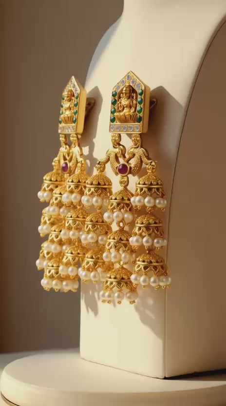 Adorned with the divine form of Goddess Laxmi set within a traditional temple arch, these layered jhumka earrings symbolise prosperity, grace, and sacred elegance — crafted to make every festive moment feel auspicious.