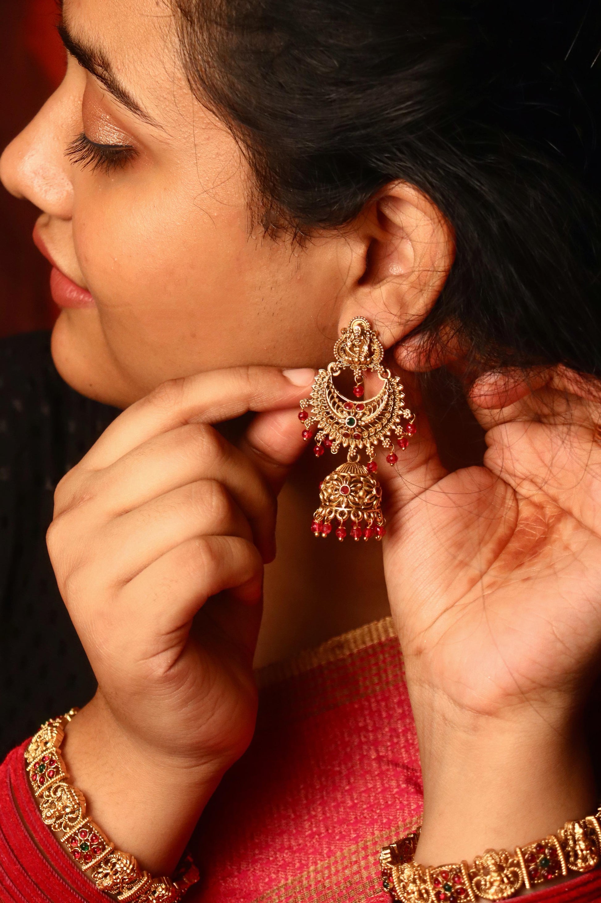 The design features a beautifully sculpted deity seated atop a crescent-shaped base, leading into a detailed dome studded with red kemp stones. Finishing the look are layers of vibrant red bead hangings that sway gracefully with movement. The structure balances weight and elegance, offering a bold yet wearable silhouette.
