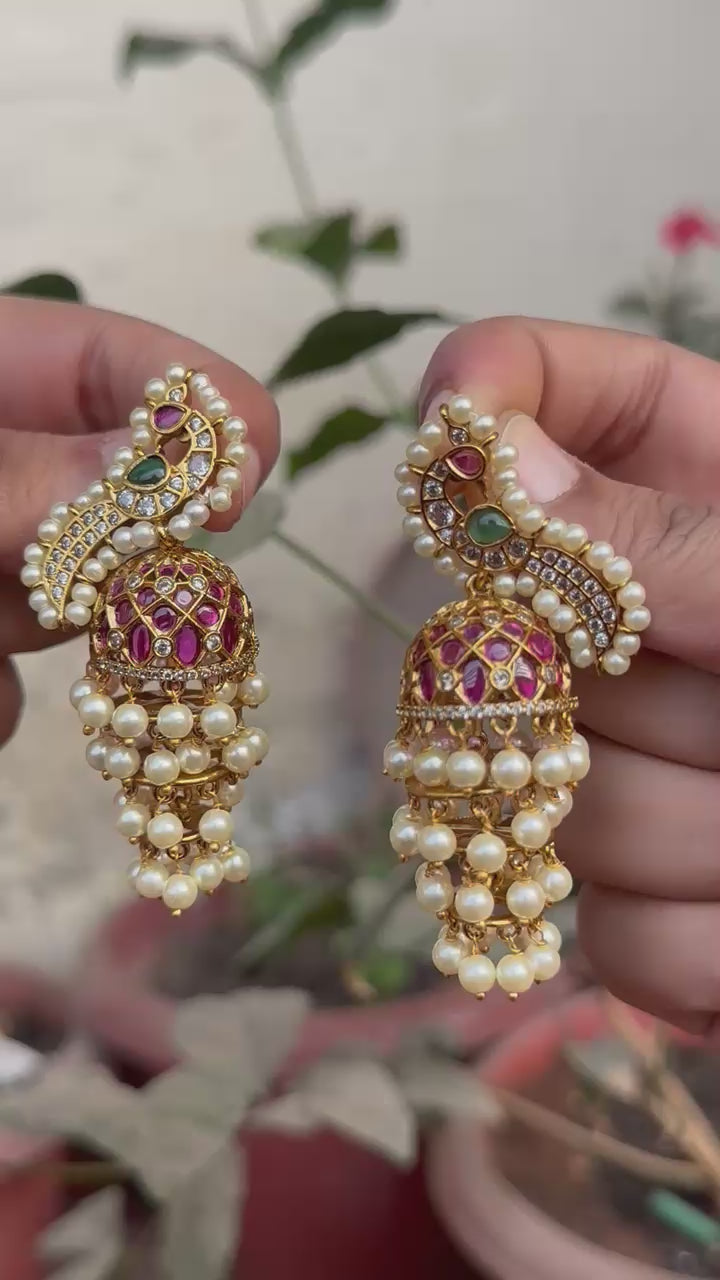 • Dome-shaped jhumki with intricate kundan-style work