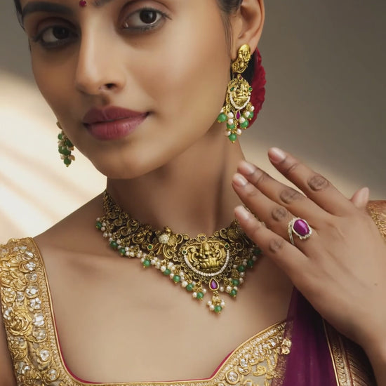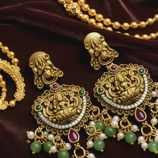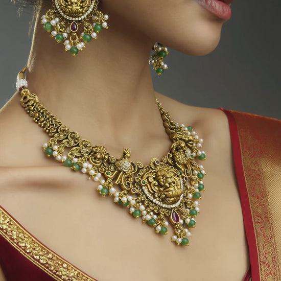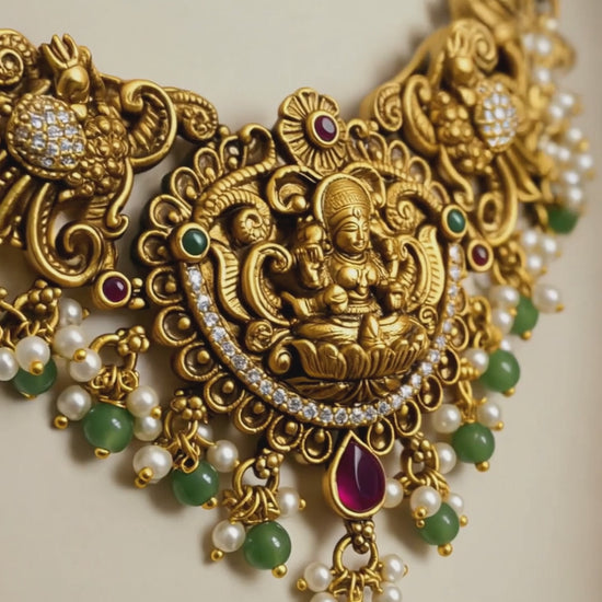 Adorned with the benevolent form of Goddess Lakshmi seated in divine grace, this temple necklace is a celebration of prosperity, protection, and sacred beauty — crafted to echo the grandeur of South Indian traditions.