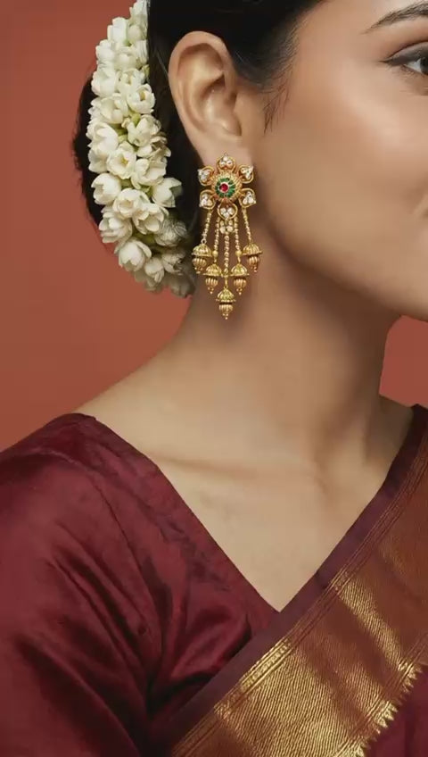 Adorned with a radiant floral motif at the top and cascading temple bell danglers below, these earrings echo the elegance of classical South Indian adornment — graceful, festive, and rooted in tradition.