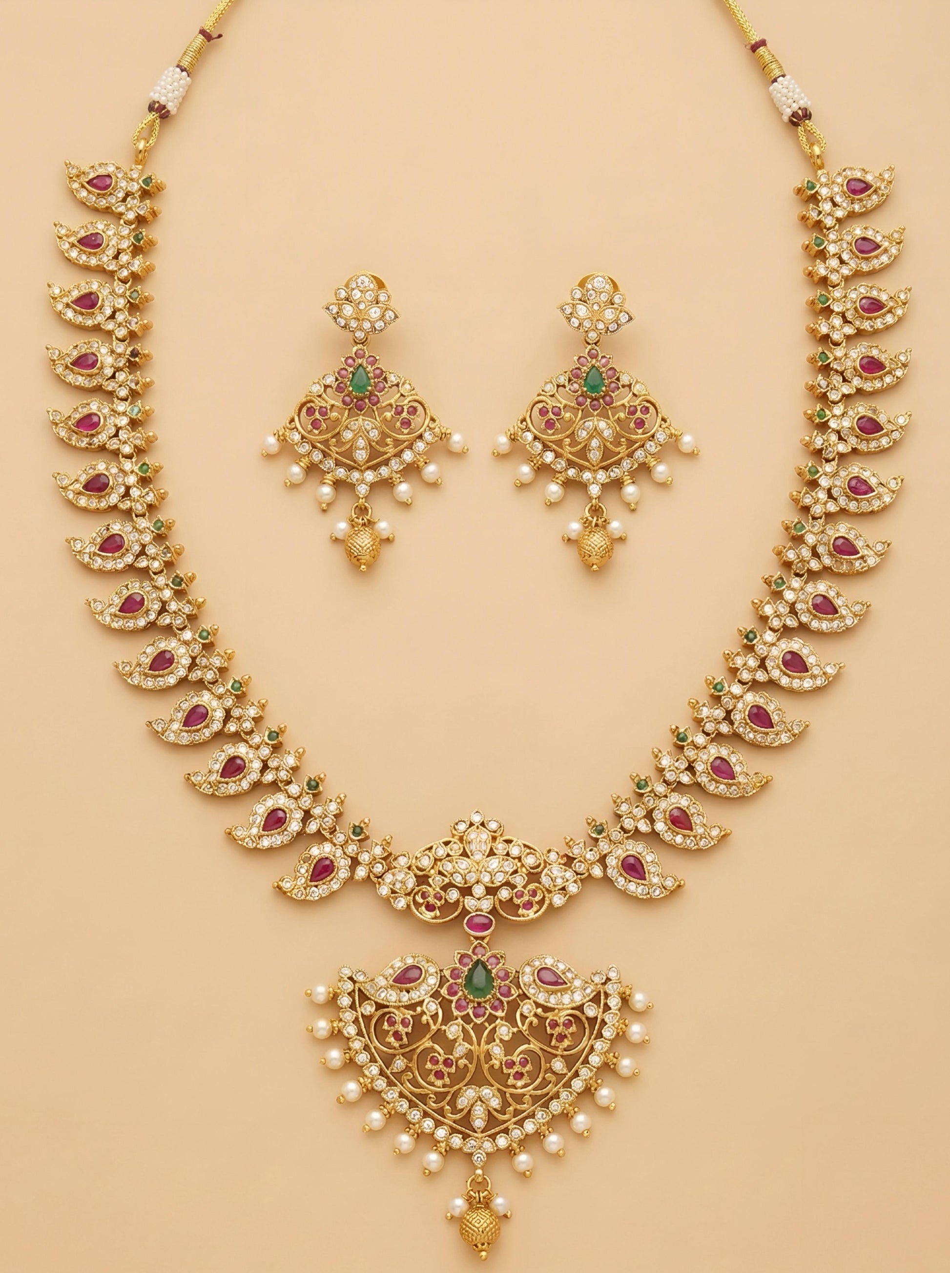 Inspired by the elegance of peacock feathers, this traditional necklace and jhumka set features rich kumkum-red stones and intricate detailing — a graceful ode to South Indian artistry and heritage.
