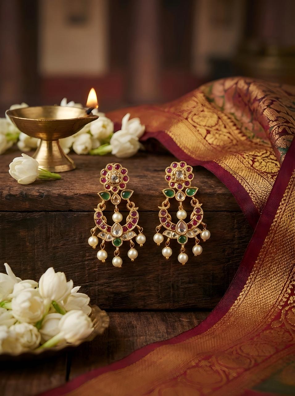 A graceful pair of traditional earrings featuring classic stone work and pearl drops, designed to add a festive touch to your ethnic looks.