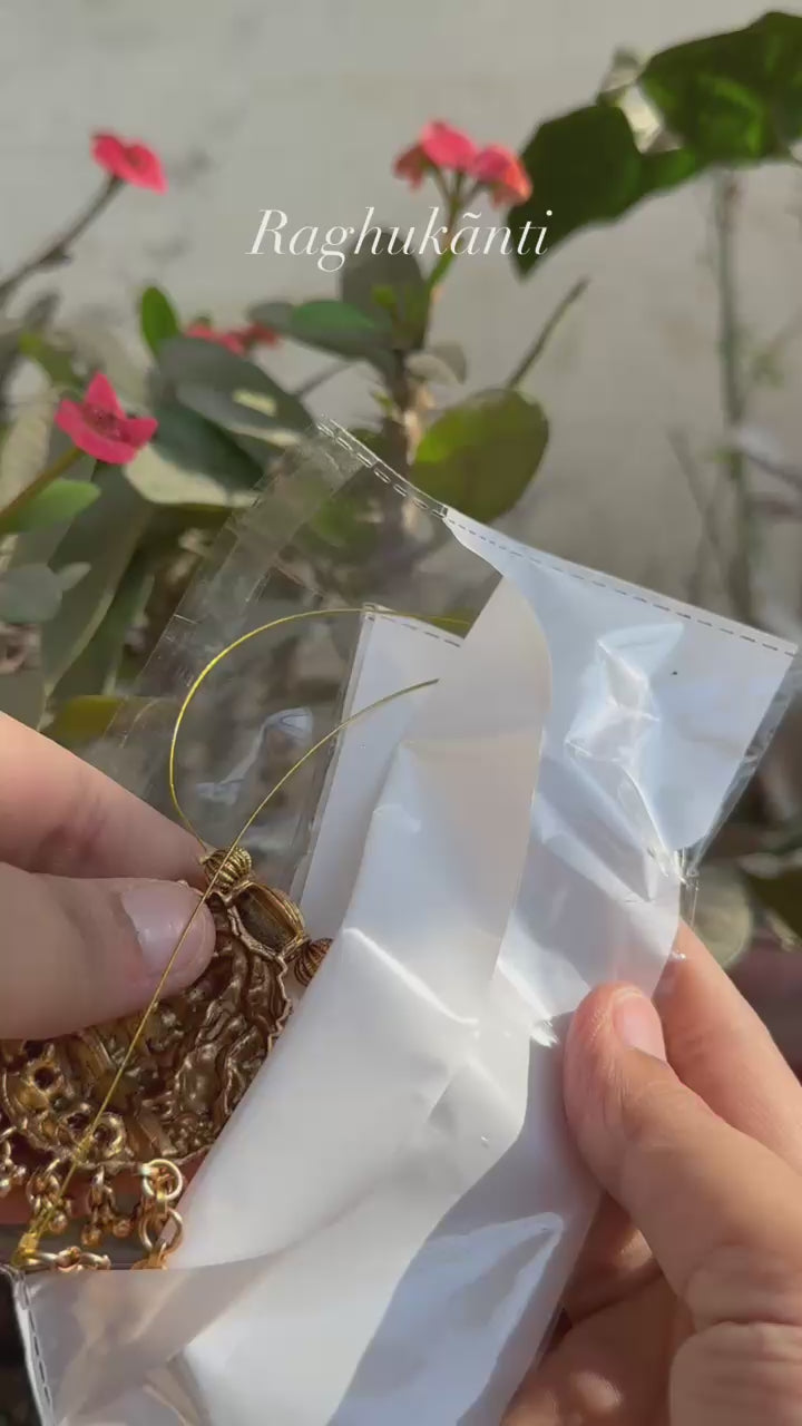 Rooted in divine symbolism, the Deetya Pendant Necklace radiates spiritual elegance with its bold Goddess Lakshmi motif. Handcrafted in antique gold tones and accented with temple-style detailing, this piece speaks to the soul of South Indian artistry.