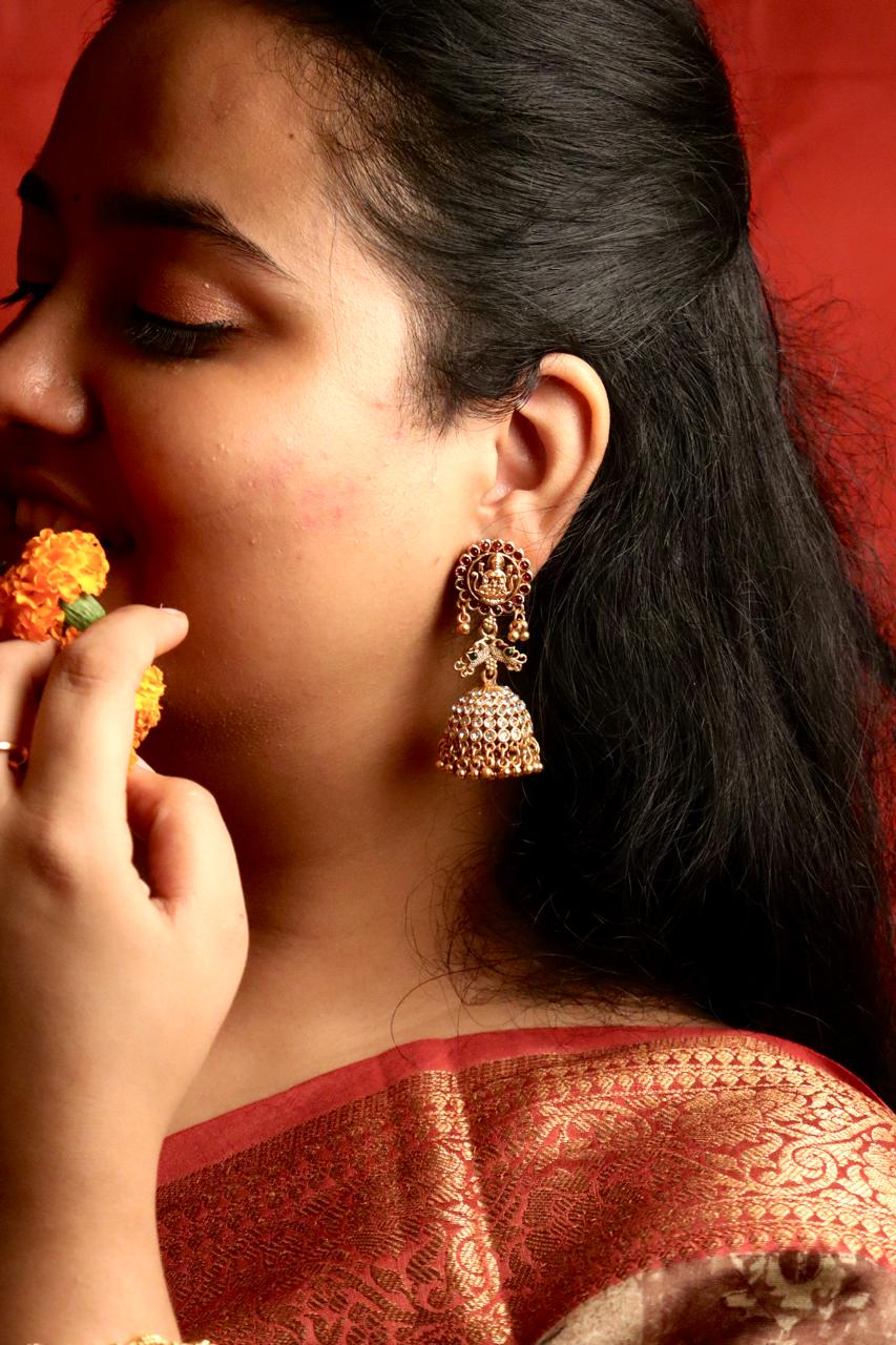 A festive Jhumki that beautifully blends divine motifs with shimmer — perfect for temple wear and celebrations.