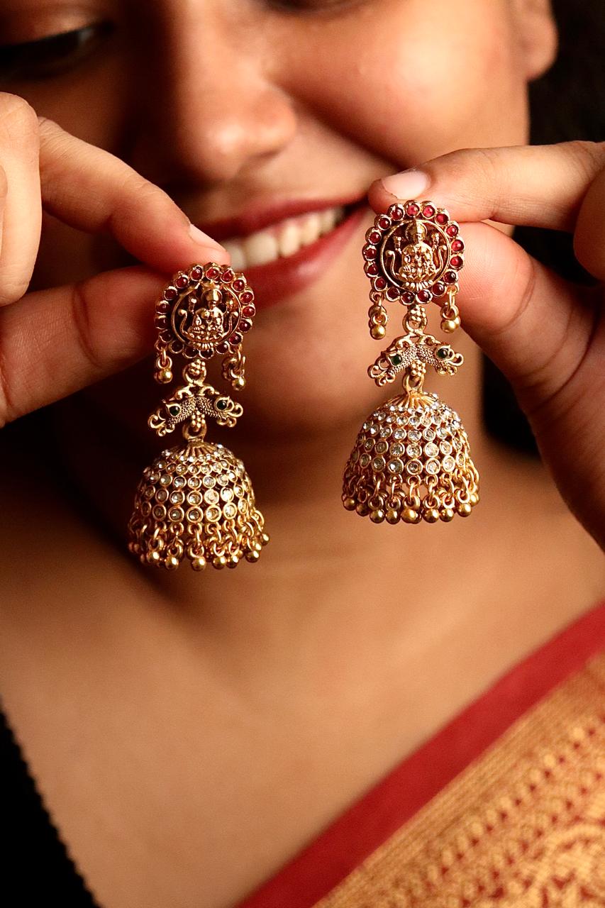 Motif: Lakshmi seated in a lotus on the stud, dancing peacock in the centre, classic dome-shaped jhumka at the base